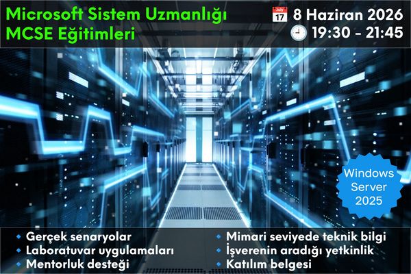 Microsoft Sistem Uzmanlığı (MCSE) modül bazlı mesleki eğitimi, canlı, gerçek hayat senaryoları ile sanal makine laboratuvar ortamında uygulamalı olarak yapılır. Sistem yöneticisi olan veya olmak isteyen katılımcılar için uygundur.